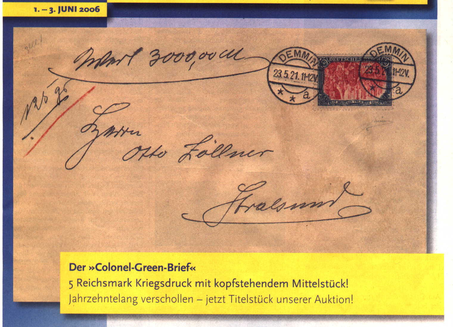5 Mk Kriegsdruck mit KOPFSTEHENDEM Mittelstück, nahezu tarifgerechte Einzelfrankatur auf dreifach schwerem Fern-Wertbrief über 3000 Mark von DEMMIN 23.5.21 nach Stralsund mit rückseitigem Ankunfts-Stempel! Eine Beförderung auf dem Postweg ist nicht sicher nachweisbar. Der Experte und für diese Ausgabe zuständige Verbandsprüfer Herr Dr. Oechsner schreibt in seinem aktuellen und ausführlichen Fotoattest: "Die Marke befindet sich in sehr guter Qualität", eine kleine Eckzahnknitterung wird der Ordnung halber erwähnt. Insgesamt sind nur drei Briefe dieses markanten Fehldruckes überhaupt in der Literatur bekannt (Kohl-Handbuch S. 957/958), von denen die hier angebotene Einzelfrankatur seit Jahrzehnten verschollen war! Gemäß nun zugänglicher Dokumente wurde der Brief im Jahr 1924 dem legendären Sammler Colonel E. H. R. Green angeboten und von diesem erworben. Dessen Sammlung internationaler klassischer Raritäten stellte seinerzeit die weltweit größte Briefmarkensammlung in Privatbesitz dar, die nur noch durch diejenige des britischen Königs Georg V. übertroffen wurde! Sensationelle Möglichkeit zum Erwerb einer zwar seit Jahrzehnten bekannten, jedoch noch nie gesehenen philatelistischen Groß-Rarität, die selbst in den umfassendsten Sammlungen bislang fehlt! - Siehe Titelfoto