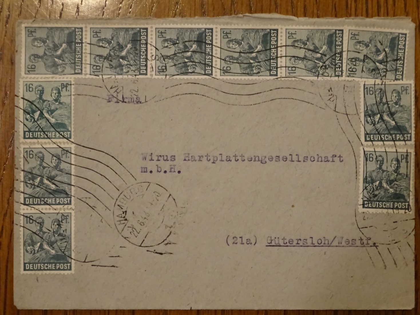 Beim zweiten Beleg in Beitrag #6 handelt es sich um einen Fernbrief vom 22.06.1948 von Hamburg nach Gütersloh. Verklebt wurde 15 × MiNr. 949. Der Beleg ist mit 240 Reichspfennig portogerecht frankiert. Jan Hohmann bewertet eine solche Verwendung in seinem oben genannten Werk mit 70 €. Der Hamburg-Stempel wird im Buch "Altstempel deutscher Postanstalten – ihre Weiter- und Wiederverwendung nach dem 8. Mai 1945" von Hans-Jürgen Richter und Peter Griese auf Seite 193 mit der Häufigkeit 2 ("selten vorkommend") gelistet.