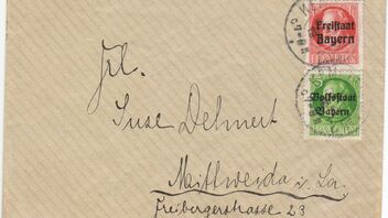 Eine Farbfrankatur der unterschiedlichen Aufrucke aus der Ludwigzeit - einmal 15 PF mit Aufdruck Freistaat Bayern (156A) und eine 5 Pf mit Aufdruck Volksstaat Bayern (117A) auf einem recht schmucken Brief