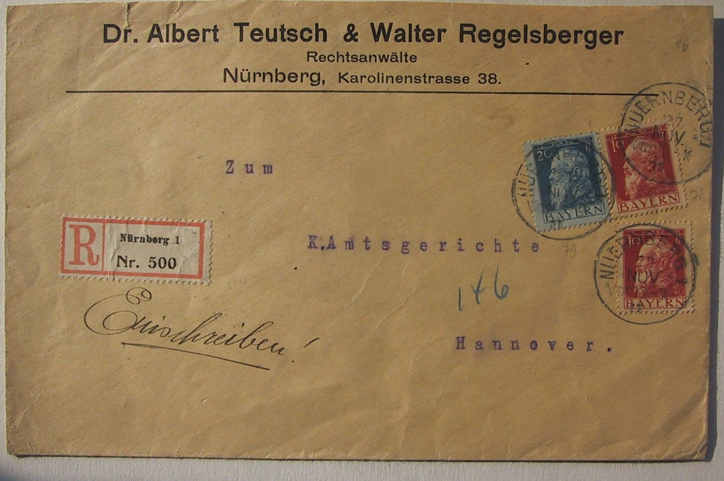 Gesendet wurde der Brief von Waldkirchen nach Schleißheim am 31. Juli 1919. Frankiert mit einem Viererblock der Nr. 122, also mit insgesamt einer Mark. Versendet wurde der Brief als Einschreiben. Außerdem steht durch Eilboten zu bestellen drauf.