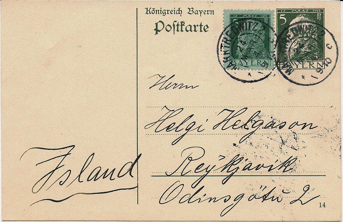 eine Postkarte aus Bayern nach Island habe ich ja bereits in meinem Thread Deutsches Reich bis 1944: "Deutschland - Dänemark Belege" gezeigt. Der Trend geht aber eindeutig zum Zweitbeleg, hier also eine weitere Postkarte nach Island: P87I/04 mit Zusatzfrankatur Mi. BY 77II.