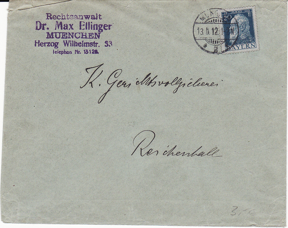 was mich an dem Brief aus (nach) Reichenhall wundert, ist das fehlen des Stempels von "Reichenhall 3" Das Hotel Axelmannstein hatte eine eigene Poststelle mit dieser Bezeichnung, um dem edlen Publikum die 5 Minuten Fussweg zum Bahnhof zu ersparen.