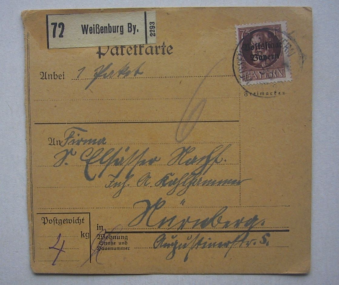 Ich möchte heute hier eine Packetkarte zeigen, die von Weissenburg Bay mit einer 75 Pf Marke frankiert worden ist. Auf Brief steht diese Marke mit EUR 10,00 im Michel-Spezial-Katalog. Das scheint mir jedoch zu knapp bemessen zu sein, da die Zeit für die Verwendung dieser Marken kaum über ein Jahr hinausging.