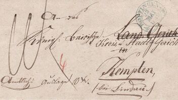 Die Aufgabepost taxierte den schweren Brief zuerst mit 4 Kr. bis zur bayer. Grenze, was falsch war, denn es war ja ein portofreier Dienstbrief, so dass man die Rötel - 4 wieder strich. Nur mit der Auslage von 10 Kr. belastet wurde er dem Empfänger zugestellt.