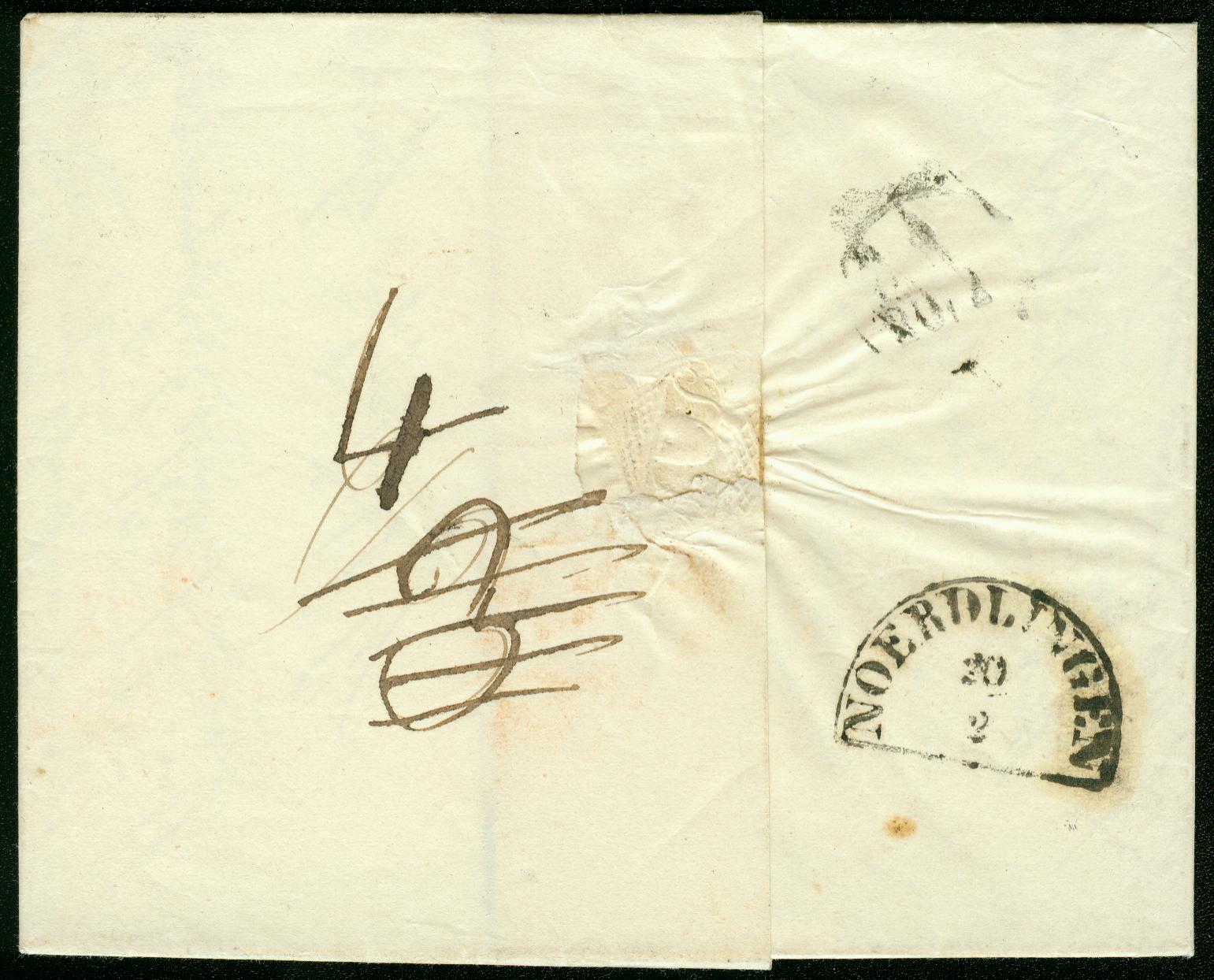 Ich habe noch einen weiteren Brief von Oettingen nach Stuttgart. Es ist ein Portobrief vom Juni 1844. Hierauf sind vorne die Taxziffern "4" für Bayern und "6" für Württemberg vermerkt.