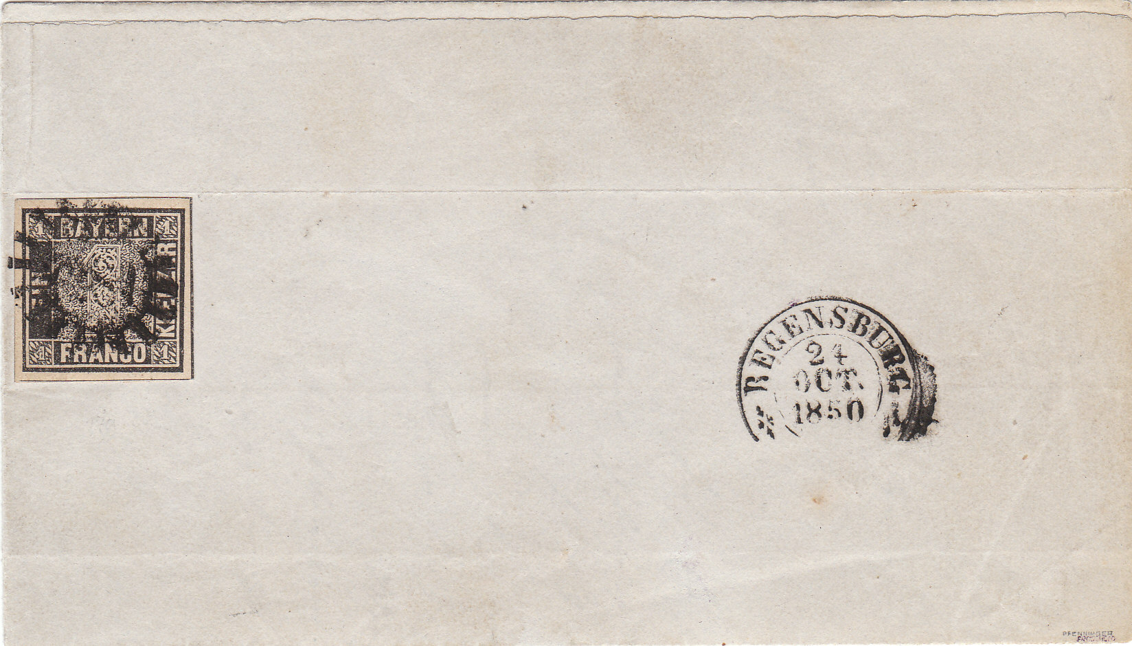 In Regensburg wurde am 24.10.1850 eine Schwarze Eins der Platte 1 für eine scheinbare Drucksache verklebt (das Kreuzband mit der Adresse hat die Zeiten nicht überlebt).