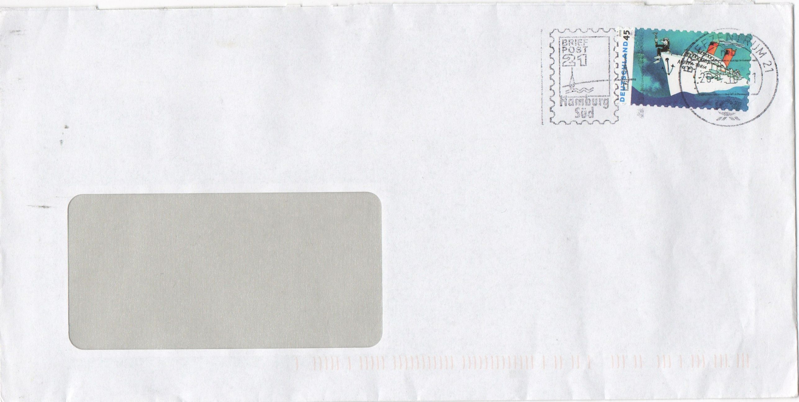 Hier habe ich 'mal wieder ein Beispiel darüber, dass auch Briefe, welche mit nur 45 Cent frankiert sind, unbeanstandet weiterbefördert werden! Die Stempelung erfolgte im BZ 21 (Hamburg-Süd)!