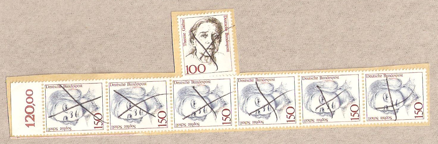 Auch immer wieder gerne genommen sind schön am Schalter gestempelte Marken, die dann auf dem Transport von den Gummibändern der Sortiermaschinen einen mitkriegen. Hier einmal besonders schön dokumentiert auf einer Zuschlagsmarke, die eine Schleifspur quer rüber aufweist. So kann man einem das Sammeln der Neuheiten auch vermiesen X( X( X(