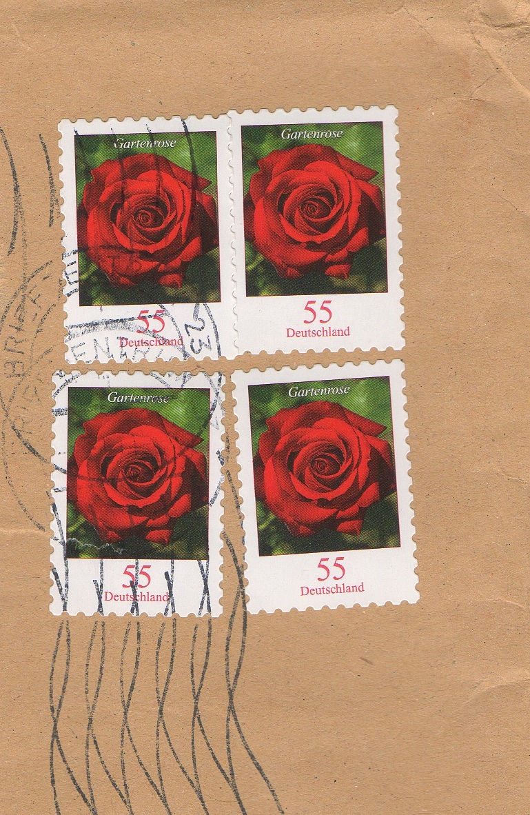 Hier habe ich eine "Doppelstempelung" der besonderen Art: Der doppelt erfolgte Rollenstempel traf die beiden linken Marken. Die obere rechte Marke wurde nicht getroffen und die darunter liegende nur sehr wenig!