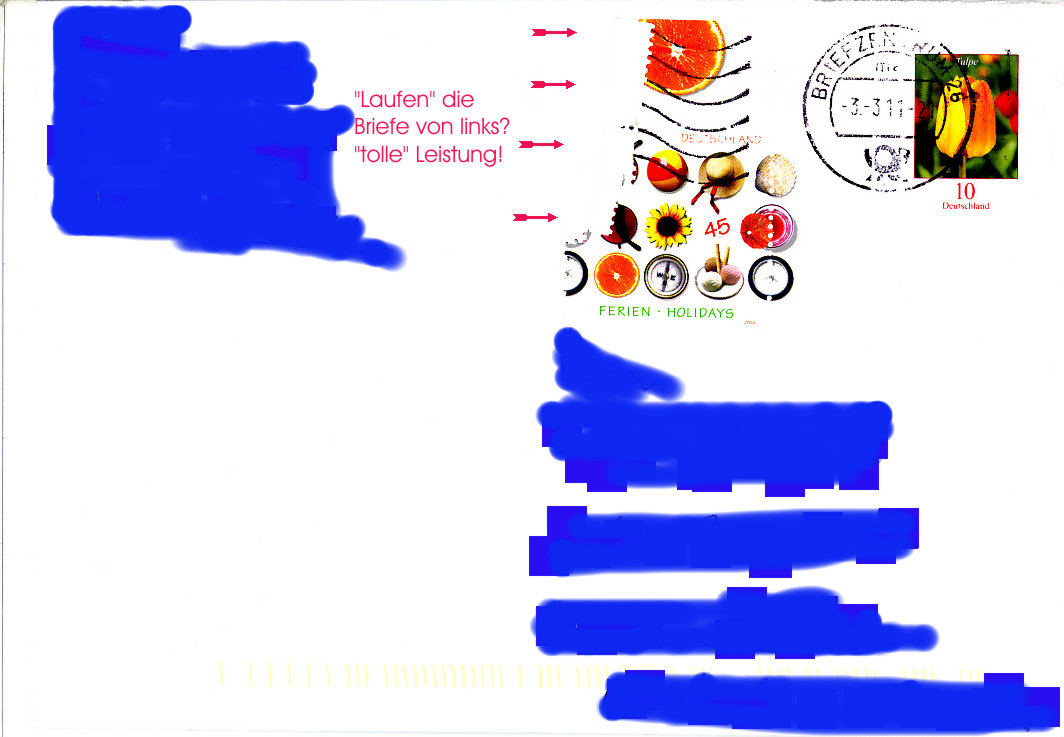 Tolle Idee: Lose Bogenränder auf die Rückseite oben rechts als "Verschlussmarke" zu kleben und das automatische Sortier- und Stempelsystem ist dann überfordert, wenn diese Seite zufällig zuerst durch die Maschine läuft...
