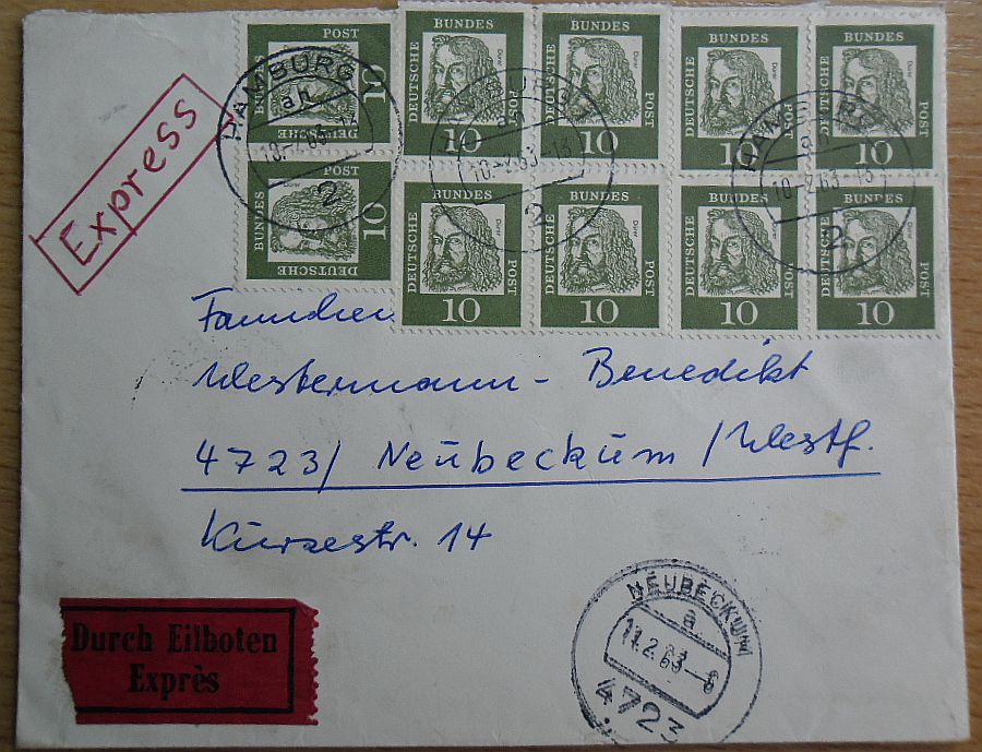 Diese verfälschten Briefmarken wurden quasi „umsonst mit gestempelt“, denn für das Porto des Briefes wären sie nicht nötig gewesen: 20 Pfennig Fernbrief + 50 Pfennig Einschreiben + 60 Pfennig Eilzustellung = 1,30 DM. Frankiert sind aber insgesamt schon mit den echten Briefmarken: 1,37 DM. Somit kleben die Spielereien sowieso einfach nur zusätzlich mit drauf.