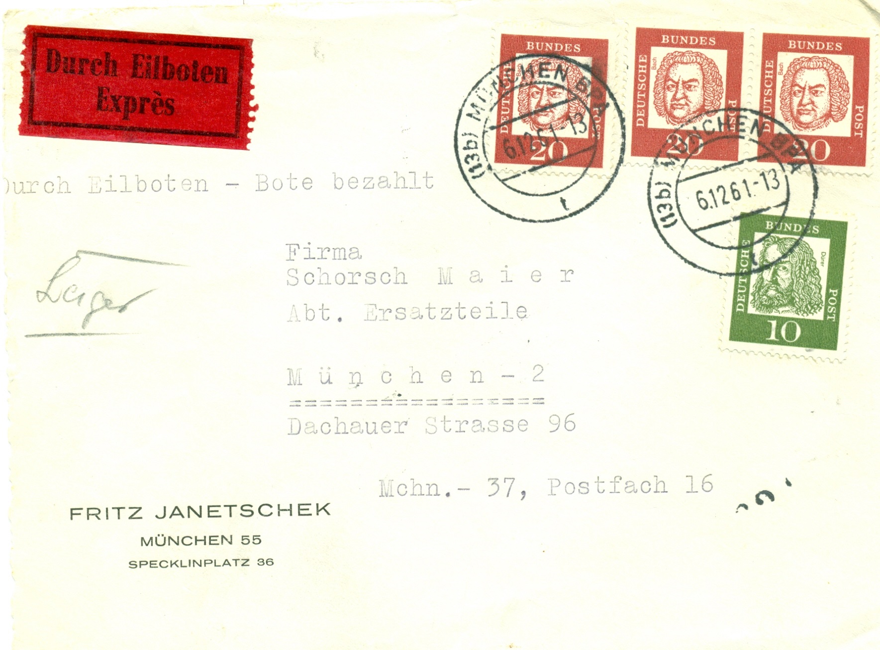Dürer 7 Pf Braun+Magnus 7Pf Braun auf Eilboten Brief Waldsassen 22.6.1962 nach Bayreuth.