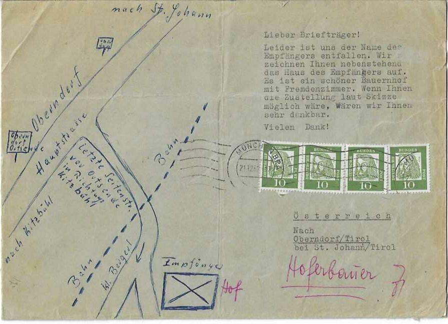 Das Thema mit den fantasievollen Adressiermöglichkeiten wurde leider nie richtig belebt. Solche Belege wie der von Rainer scheinen also in der Tat (zum Glück für die Post) nur selten vorzukommen.