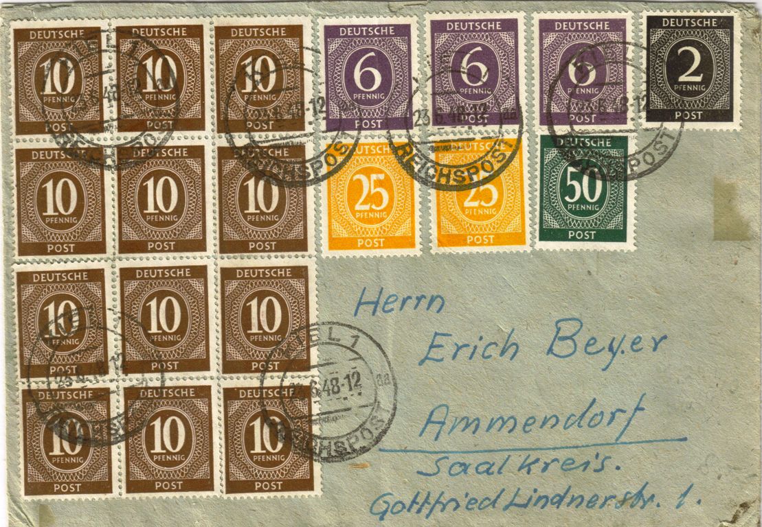 Der nächste Beleg ist ein Brief von Zeitz nach Freren bei Hannover. Auch hier komme ich mit dem Porto nicht klar. Interessant ist hier die Mischfrankatur mit der Marke von der SBZ. aber 60 Pfennig ist wohl etwas viel.