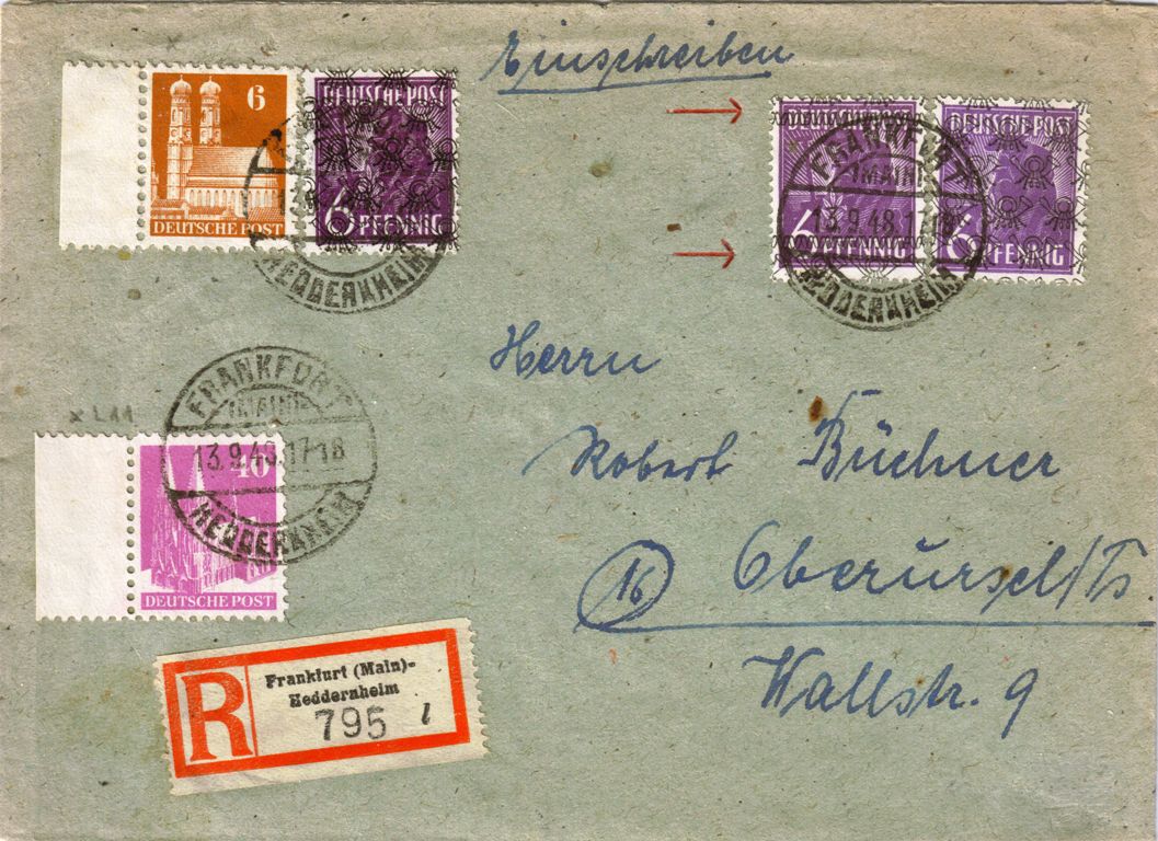 Der dritte Beleg ist ein Einschreiben von Bottrop nach Witten an der Ruhr frankiert mit einer 937 gestempelt am 28.7.1947. Woher kommt hier die 1 Mark Porto ??