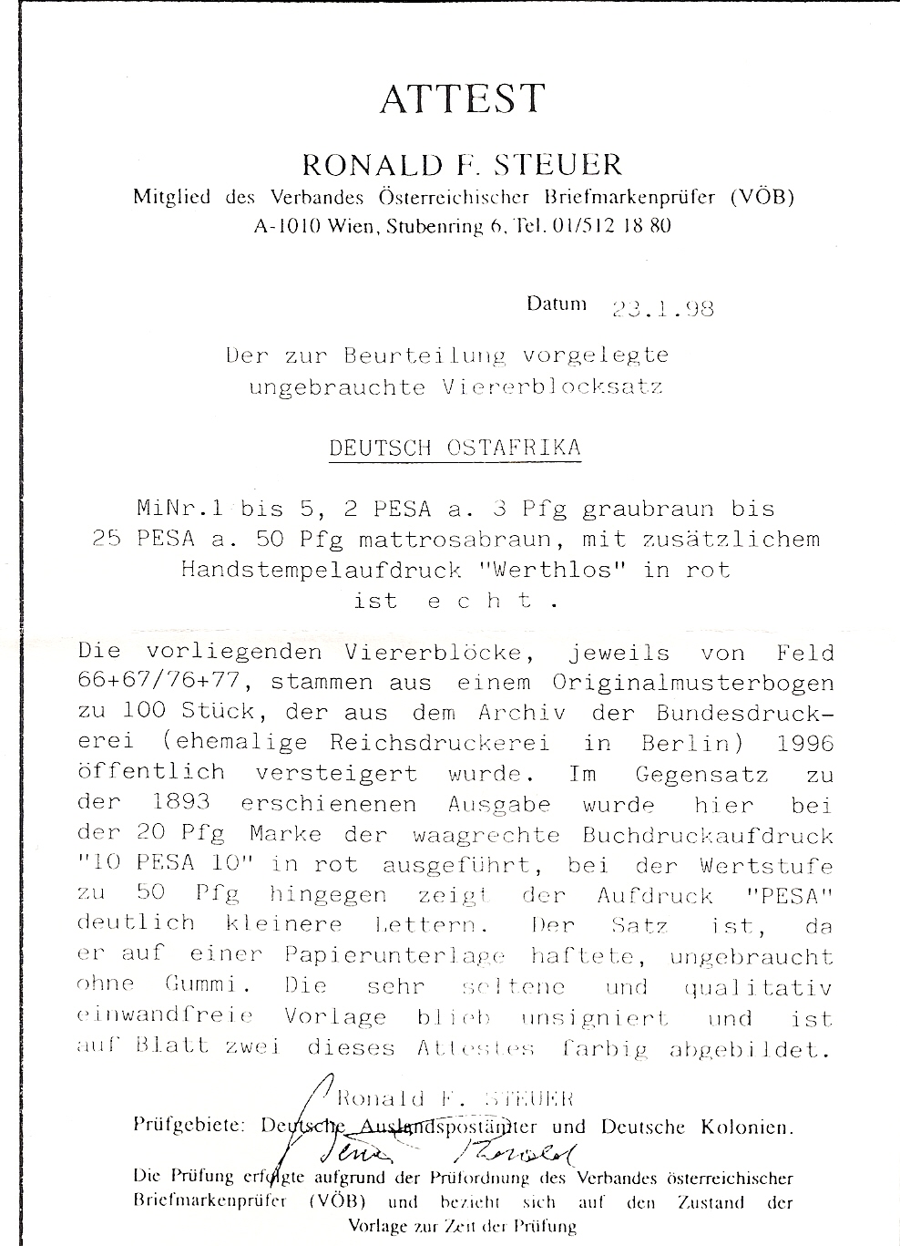 Aus dem Archiv der Bundesdruckerei, kompletter Satz mit Attestkopie des Viererblockes aus dem dieser Satz stammt