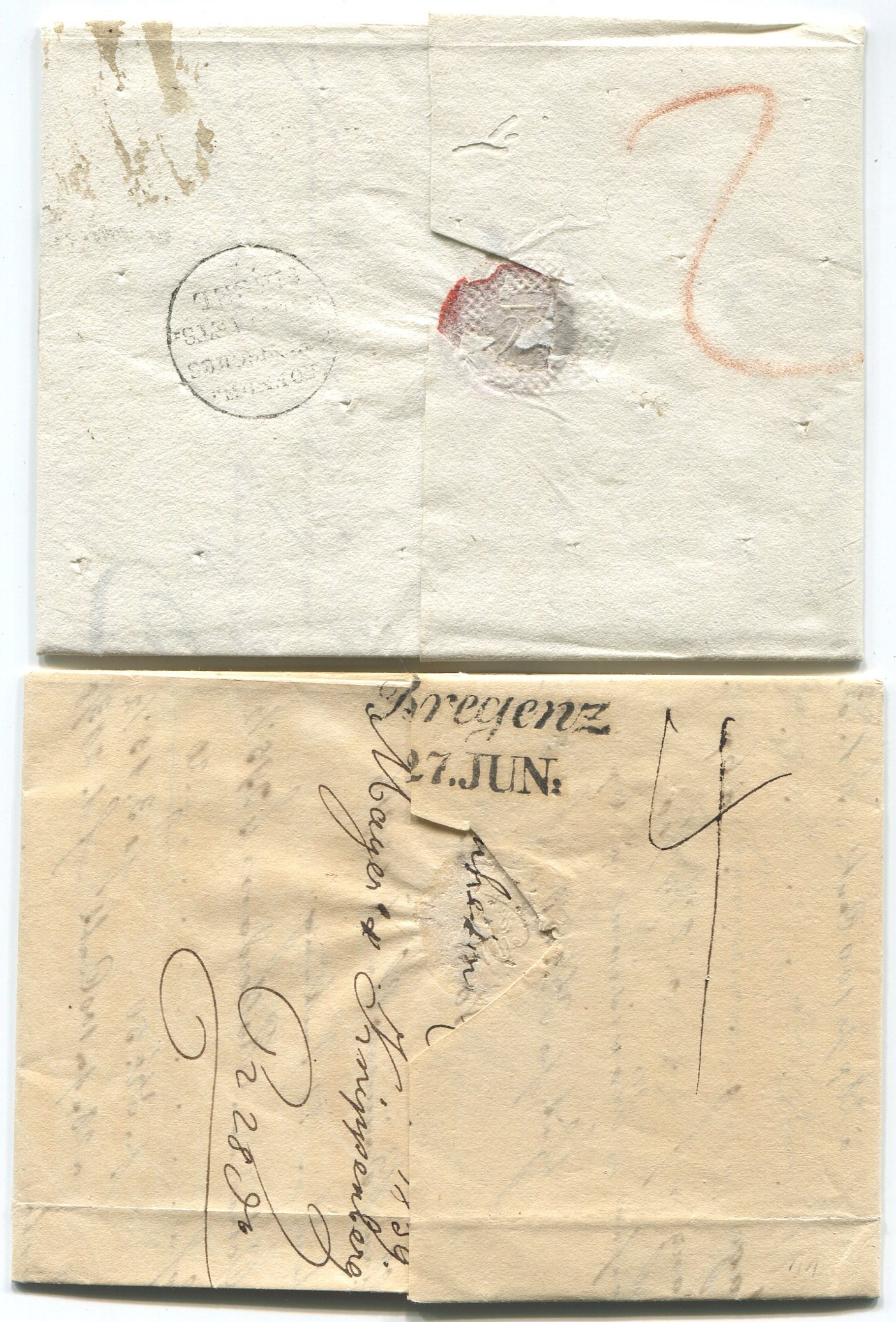 Der Augsburg-Dornbirn Brief verstehe ich auch nicht ganz. 1817 war in der Zeit vor die Frankozwang. Aber hier ist es 9 Kreuzer bezahlt. Oder könnte es 6 Kreuzer sein. Wenn es 6 Kreuzer ist passt es mit ein einfacher Brief nach Lindau. Ist es 9 liegt der Brief in die 2. Gewichtsstufe. 2 Kreuzer von der 22 sind den Botenlohn. Dann ist 20 zurück. aber 20 Kreuzer CM auch für die 2. Gewichtsstufe liegt auch sehr hoch. Wahrscheinlich ist der Brief über irgend anderen Grenzpunkt gelaufen. Aber ohne die Österreichischer Taxen zu kennen, wage ich es nicht zu raten. Vielleicht weiss jemand anderen hier etwas davon.