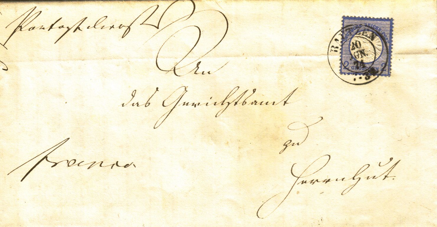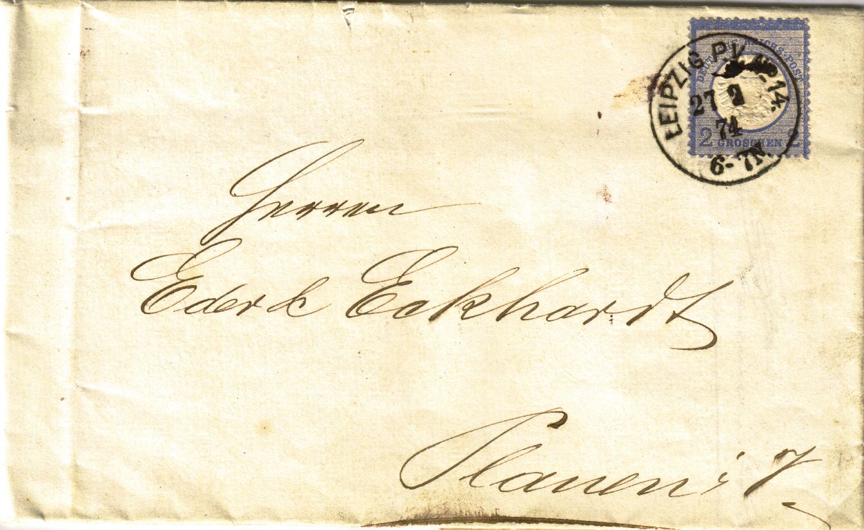 Der Erste Brief mit der Nr. 20 zu 2 Groschen ging an einen Herrn Ederd? Eckhardt in Plauen gestempelt am 27.2.74 6-7N in Leipzig P.V. No.14,