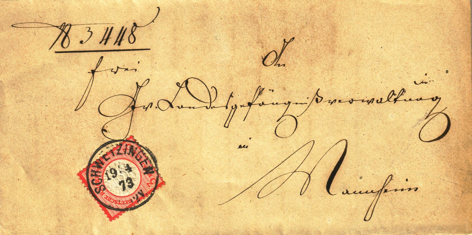Der Dritte Brief ist mit einer Nr. 25 zu 3 Kreuzer frankiert und ging an die Landesgefängnisverwaltung in Mannheim. Gestempelt ist er in Schwetzingen am 19.4.73 ?-2V.
