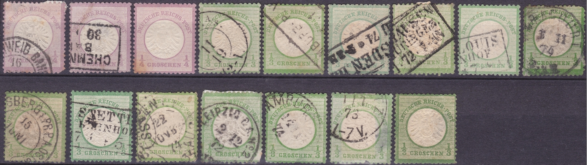 zu Bild 1: Bei der 1/4-Groschen-Marke gibt es zwar Farbunterschiede (grauviolett und lebhaftgraupurpur [flieder]), sie werden im Katalog aber nicht gesondert bewertet. Bei den 1/3-Groschen-Marken gilt als Faustregel, dass alles mit gelblichem Einschlag der billigeren a-Farbe (gelblichgrün bis [dunkel]gelbgrün) zuzuordnen ist, alles mit bläulichem Einschlag (ohne Gelb!) für die b-Farbe ([dunkel][grau]smaragdgrün, [dunkel]grünlicoliv) in Frage kommt. Letztlich entscheidet das aber der Prüfer - auf Deinem Scan sind einige heiße Kandidaten für MiNr. 17b dabei, aber wie gesagt, oft ist es dann nach Prüfung doch nur eine a-Nuance.