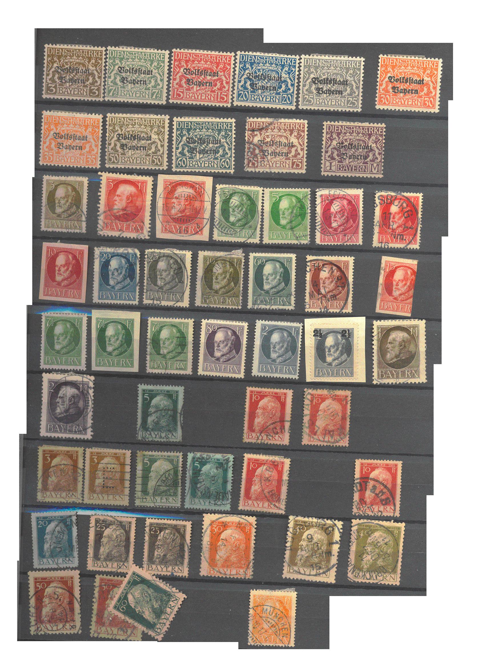 Also bei den Bayernmarken sind ein paar bessere Werte dabei, wie zum Beispiel 40,60,75 Pf und die 5 Mark mit Aufdruck Freistaat Bayern in gestempelter Erhaltung.