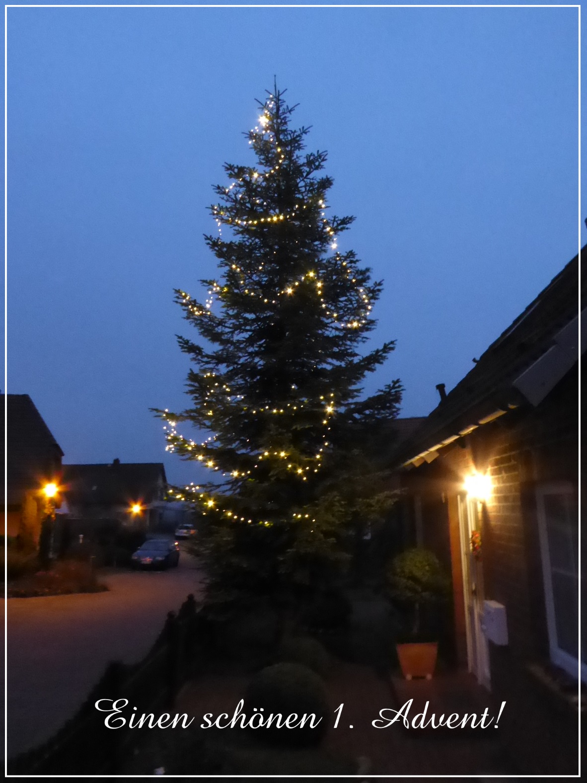Das ist die Tanne vor unserem Haus. War gar nicht so einfach die Lichter in die wohl fast 8m hohe Spitze zu bekommen. ;)