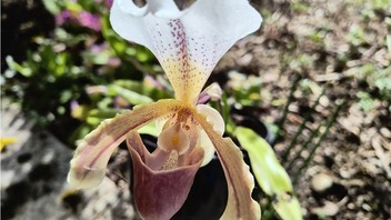 Es handelt sich um eine Venusschuh-Orchidee, eine Tropenpflanze aus Südasien die hierzulande von Orchideengärtnern als Zimmerpflanze verkauft wird. Das ist heute Massenproduktion. Ich habe sie bestimmt schon zwanzig Jahre und dieses Jahr hat sie nach längerer Pause wieder einmal geblüht. Den Sommer über, ab den Eisheiligen bis zu den ersten angedrohten Nachtfrösten verbringt sie draußen denn sie brauchen die kalten Nächte für den Blütenansatz. Nach der Blüte stirbt der Trieb ab, aber nicht ohne vorher einen neuen Seitentrieb zu bilden.