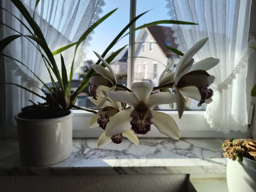 Ich habe schon seit meiner Uni-Zeit zwei Orchideen als Zimmerpflanzen die im vergangenen Jahr nach Türkenfeld umgezogen sind. Sie stehen jetzt auf der Fensterbank hell und absonnig. Der Cymbidie hat dies offensichtlich gefallen denn dieses Jahr hat sie seit langem wieder Blüten angesetzt. Cymbidien sind für Zimmerpflanzen schon sehr wuchtig, insbesondere durch ihr hohes grasähnliches Laub. Meine ist natürlich eine Zuchtform. Die Urformen stammen aus China und Südostasien, auch in Australien kommen sie vor.