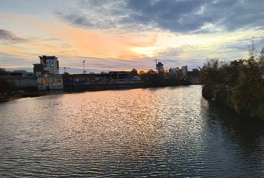 4) Abendstimmung auf dem Rückweg von der Bibliothek zur S-Bahn. Im Hintergrund oben rechts die bekannteste Bauruine Hamburgs, der Elbtower