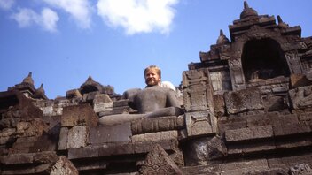 Buddha mit "neuem Kopf". Borobudhur, Insel Java, Indonesien.