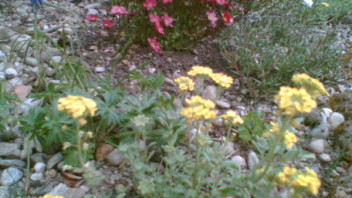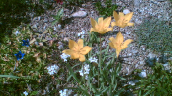 Natürlich blüht ganz jahreszeitgemäß die echte Christrose (helleborus niger praecox), aber die Kissenprimel (primula vulgaris) und der Enzian (gentiana angustifolia) sind viel zu früh (Primel) oder noch sehr, sehr spät (Enzian) dran. Selbst die ersten Veilchen (viola odorata "Königin Charlotte) blühen schon mit zwei Exemplaren.
