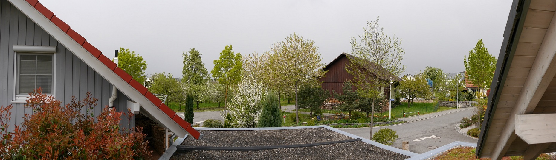 Bild 1 ist um 11:40 aufgenommen. Momentan sieht es relativ bleu aus, aber Bild 3: hinterm Haus zieht es schon wieder zu.