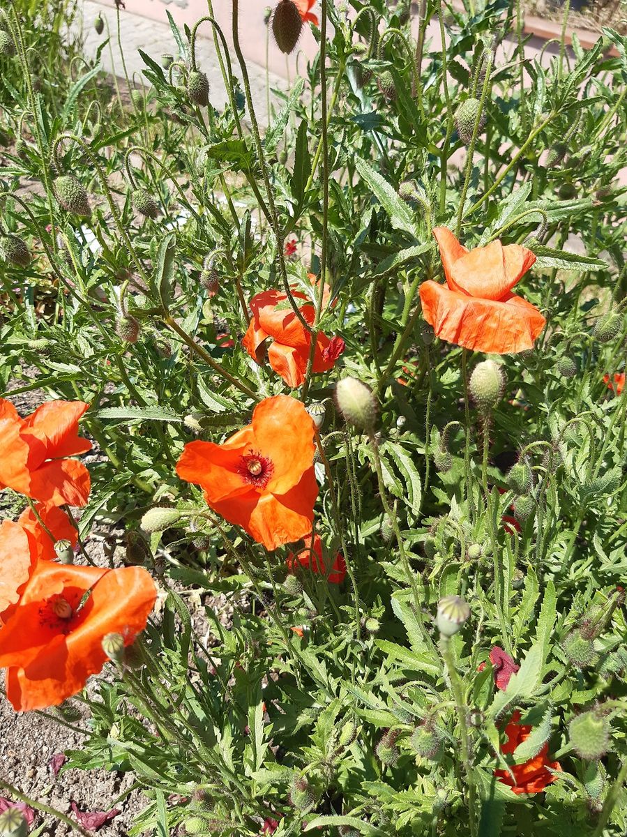 Da mache ich auch gleich mit. Zuerst wurden die Mohnblüten fast ertränkt,vom vielen Regen und jetzt erstrahlen sie in der Sonne.Eine wide Rose und ein Blümchen auf der Wiese.