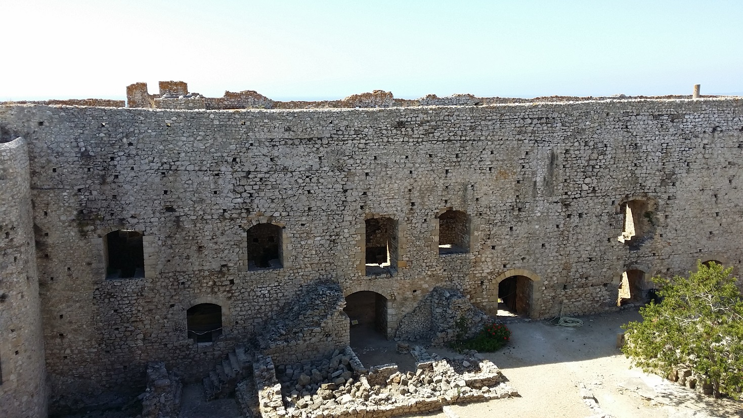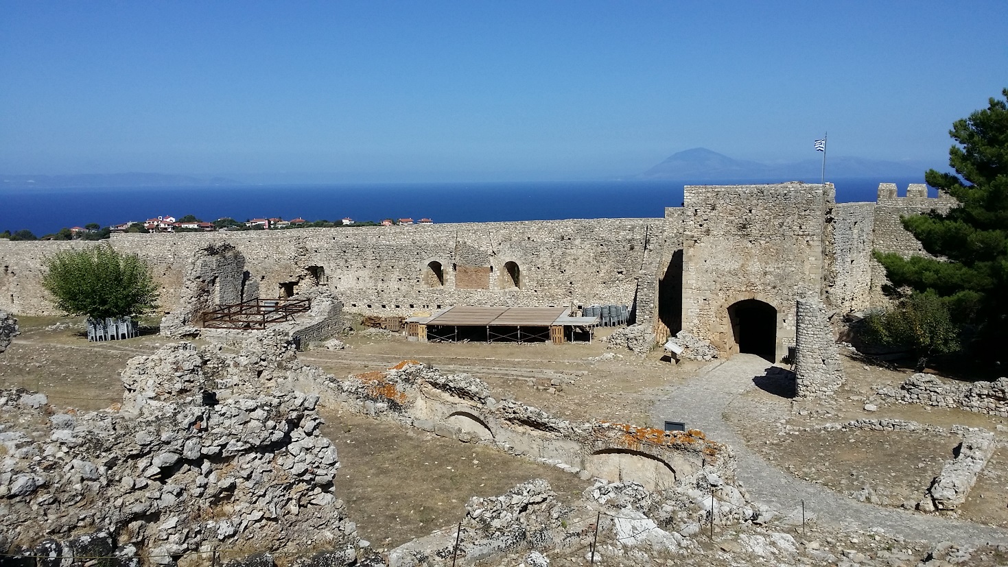 Auf einem Hügel, zu Fuße des kleinen Örtchen Kastro, befindet sich die Burg Chlemoutsi. Von unserer Terasse haben wir einen schönen Blick auf die nachts beleuchtete Burg.