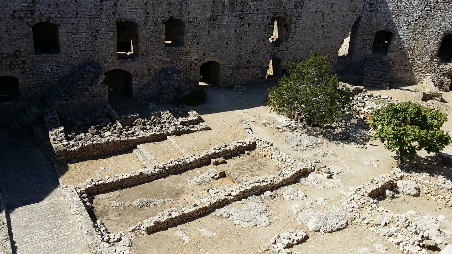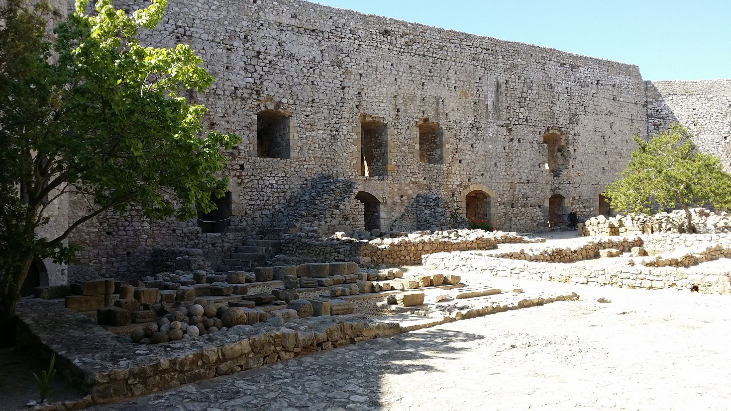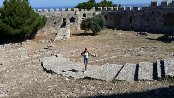 Auf einem Hügel, zu Fuße des kleinen Örtchen Kastro, befindet sich die Burg Chlemoutsi. Von unserer Terasse haben wir einen schönen Blick auf die nachts beleuchtete Burg.