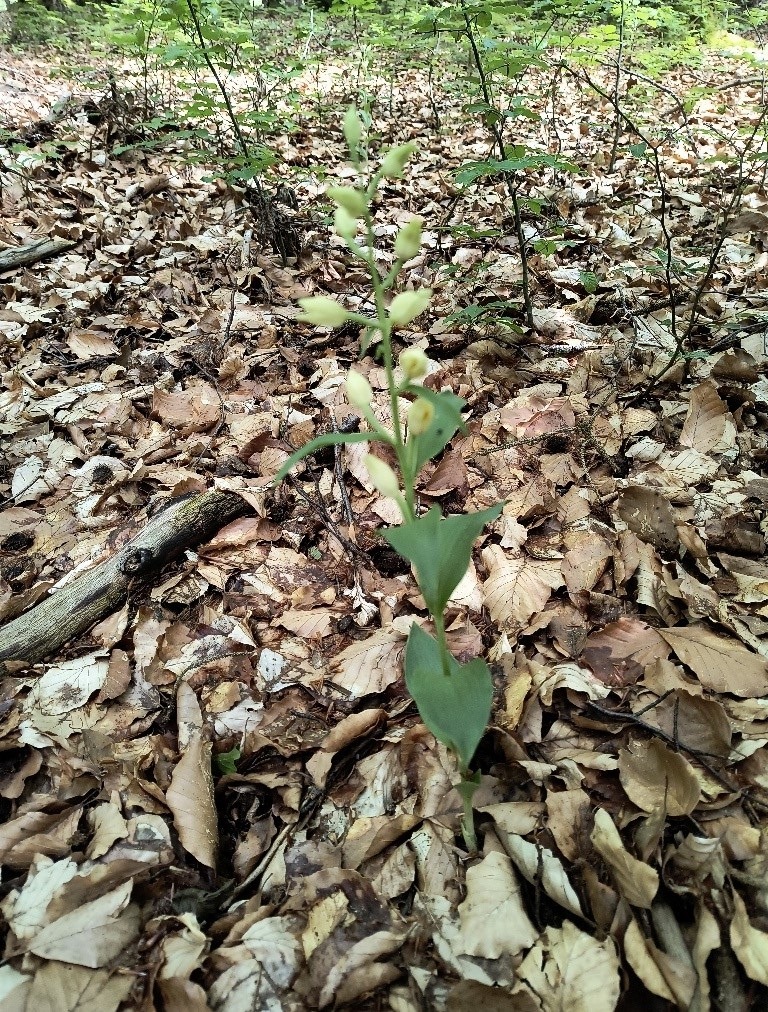 Dann ein weißes Waldvögelein, eine heimische Orchidee, hier mit Knospe aber noch nicht aufgeblüht. Drei Exemplare habe ich gesehen, sie lieben lichten Buchenwald. Sicherlich habe ich auch das eine oder andere Exemplar übersehen, wenn sie erst blühen wird es einfacher.