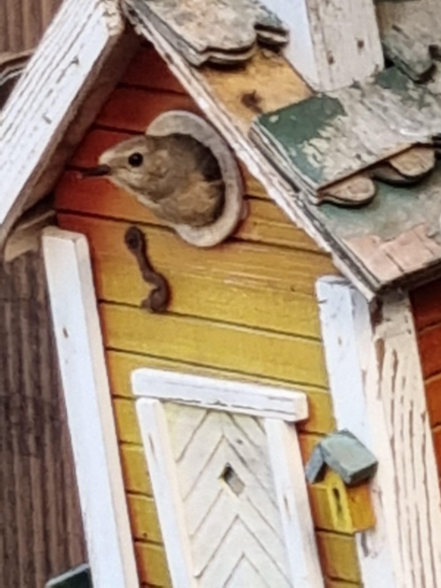 Ein Rotschschwänzchen brütet im Vogelhäuschen.
