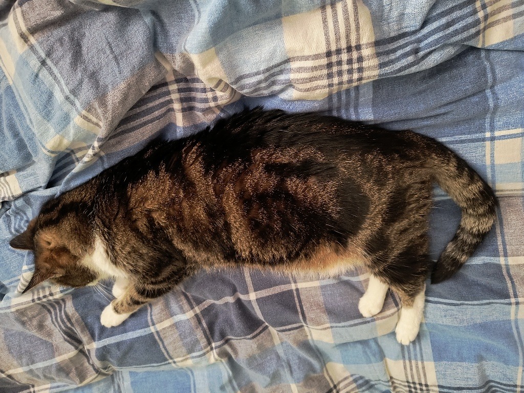 wieder mal geschafft, mein Gastkater beim Mittagssschlaf. So entspannt schläft eine Katze nur wenn sie sich hundertprozentig sicher fühlt, sonst rollt sie sich zusammen.