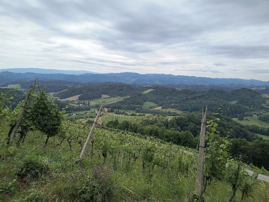 Photo 2: Aussicht nach Slowenien vom Plački vrh. Da man nach Süden blickt sieht man natürlich die Nordhänge der Berge. Gefühlt mehr Wald als in der Steiermark, aber die Weinberge findet man natürlich auf den Südhängen.