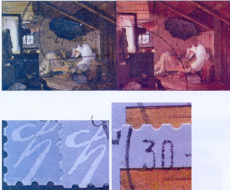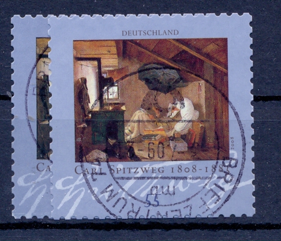 Beim Scan hat der Engel oben die vertikale Schrift bei der linken Marke nach links geblasen, bei den unteren Marken fängt rechts der Herr Spitzweg mit seiner Unterschrift direkt bei zwei Stanzlöchern an.
