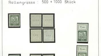 Eine Besonderheit gibt es noch bei Posthorn und Heuss I. Hier wurden Rollen hergestellt, die keine Nummerierung hatten. Um hier die Rollenmarke zu dokumentieren, benötigt man schon den 11-er-Streifen, da der Bogen ja nur 10 senkrechte Marken hat, dann kommen die Randstücke. Hier solche Stücke im Bild vorgestellt: