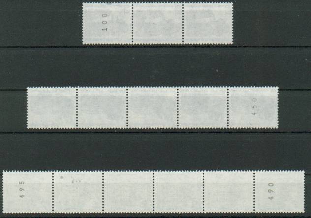 Wem nun die Einzelmarken „zu wenig“ sind, der kann auch noch Streifen sammeln. Am gängigsten sind hier Streifen zu 3, 5, 6 und 11 Marken. Wobei die 6-er- und 11-er-Streifen oben und unten eine Nummer haben sollen! So sind sie auch im Michel-Handbuch Rollenmarken katalogisiert. Auf den Katalog gehe ich später noch ein. Hier im Bild eine Auswahl der Streifen: