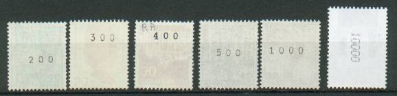 Beginnen möchte ich mit den Einzelmarken. Hier gibt es verschiedene Typen der Nummern zu beachten. Der alte Nummerntyp sind die waagerechten Nummern. Diese sind von der Serie Heuss I bis zur Serie Sehenswürdigkeiten auf die Gummierung gedruckt worden. In der Rolle trägt jede 5. Marke eine Nummer.