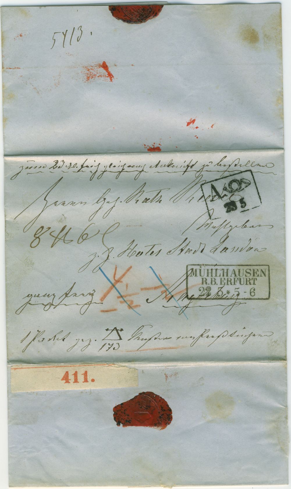 Es handelt sich um eine Paketbegleithülle, auf welcher gleich zweimal ein Packkammer-Stempel von Magdeburg abgeschlagen wurde. Laut meinen Unterlagen wurde dieser Stempel von etwa 1848 bis 1864 verwendet. Allerdings soll sich dieser auch auf einen Beleg vom 12.08.1872 von Magdeburg noch befinden.