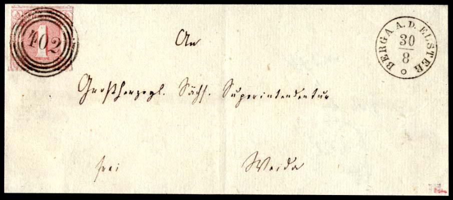TuT-Vierringstempel 402 von Berga a.d.Elster. Eröffnet 1864 - aus Großherzogentum Sachsen-Weimar-Eisenach. Dazu einen Brief von Berka a.d.Elster mit Ortsaufgabe-Stempel vom 30.8. (1866).