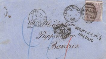 Die britische "2" für das 2. Gewicht wurde in Preußen fehlinterpretiert als fehlende 2 Pence. Diese wurden in 2 Sgr. reduziert, welche paritätisch 7 Kreuzern entsprachen. Dazu kämen dann die 2 Kr. für die Bestellung in Bad Ems und wir hätten 9 Kr. für den Empfänger zu zahlen gehabt.