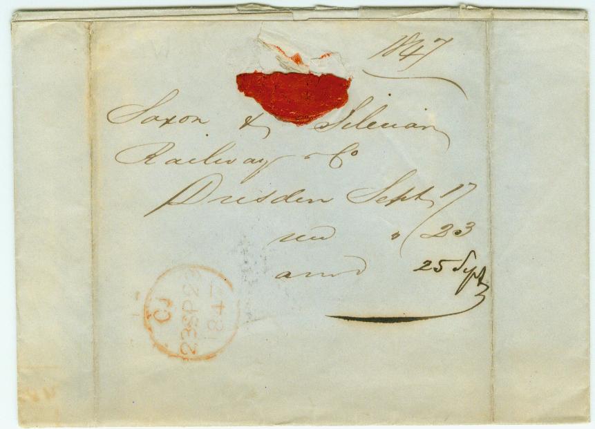 Schaue hier ein Brief von Dresden nach London via Ostende,am 18. 9. 1847, Ankunftsstempel in London am 23.9.1847.