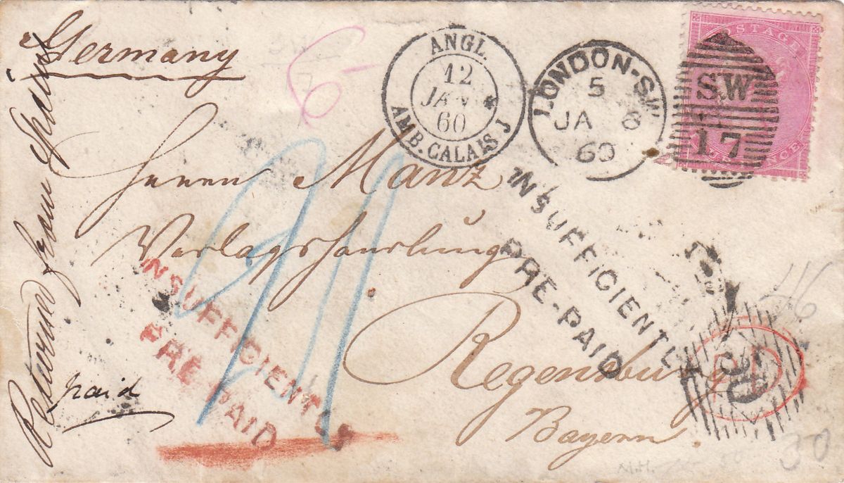 Die britische "2" für das 2. Gewicht wurde in Preußen fehlinterpretiert als fehlende 2 Pence. Diese wurden in 2 Sgr. reduziert, welche paritätisch 7 Kreuzern entsprachen. Dazu kämen dann die 2 Kr. für die Bestellung in Bad Ems und wir hätten 9 Kr. für den Empfänger zu zahlen gehabt.