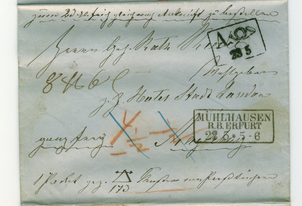 Magdeburg stellt aber auch dies in den „Schatten“. So gab es die ersten Stempel schon 1806. Insbesondere die Postsekretäre Hichtel und Meissner organisierten die dortige Paketabfertigung und „verewigten“ sich auf Belegen mit Namenstempel in Schreibschrift. Diese und noch mehrere verschiedene Stempel, werden alle als „Posthörnchenstempel“ bezeichnet. Grund der Namensgebung sind aber hier die späteren Vorläufer, weil ein Posthorn im Stempel sichtbar ist.