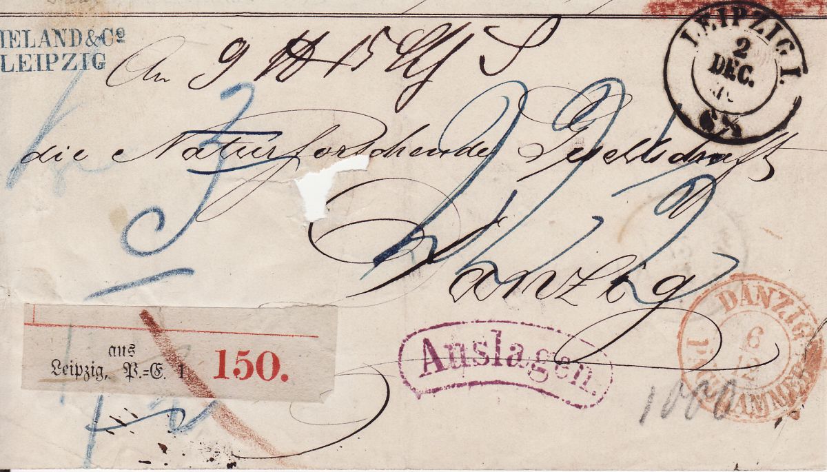 ich hab hier noch einen Packkammerstempel von Danzig auf einem Briefaufausschnitt gefunden. Leider ist die Jahreszahl des Leipziger Stempels nicht genau lesbar. Ich würde aber hier auf 2.Dez.1870 tippen. Der Stempel hat einen Aussen-Durchmesser von 25mm.